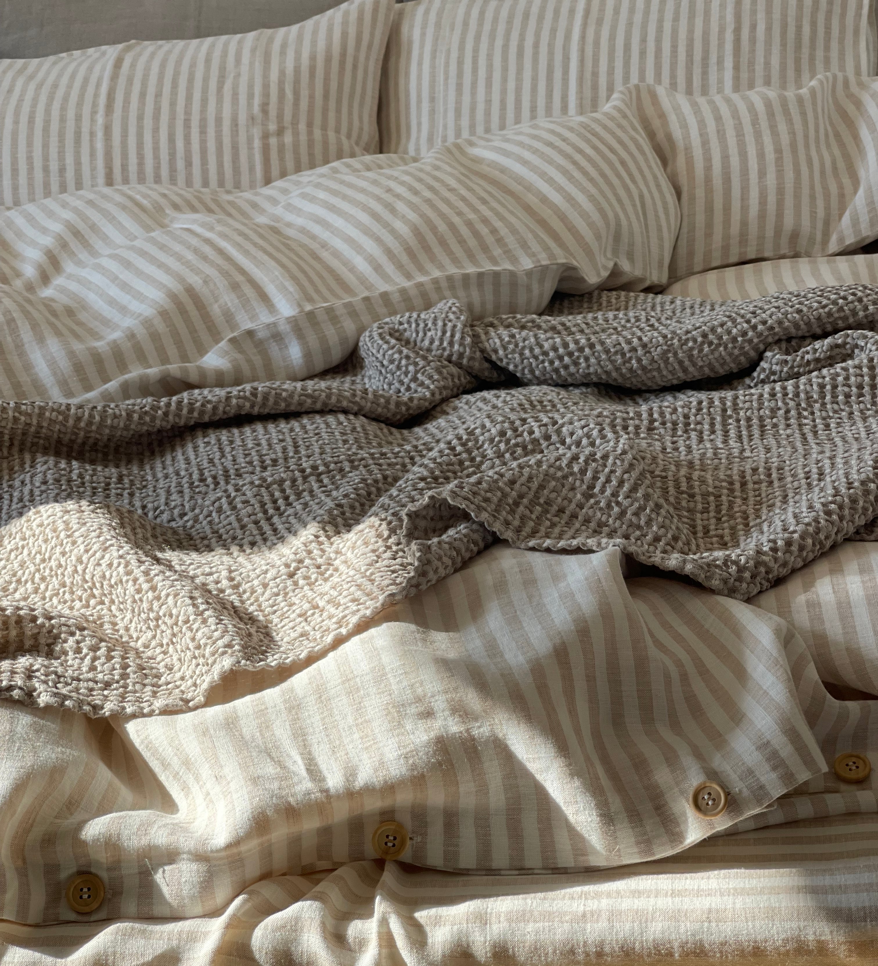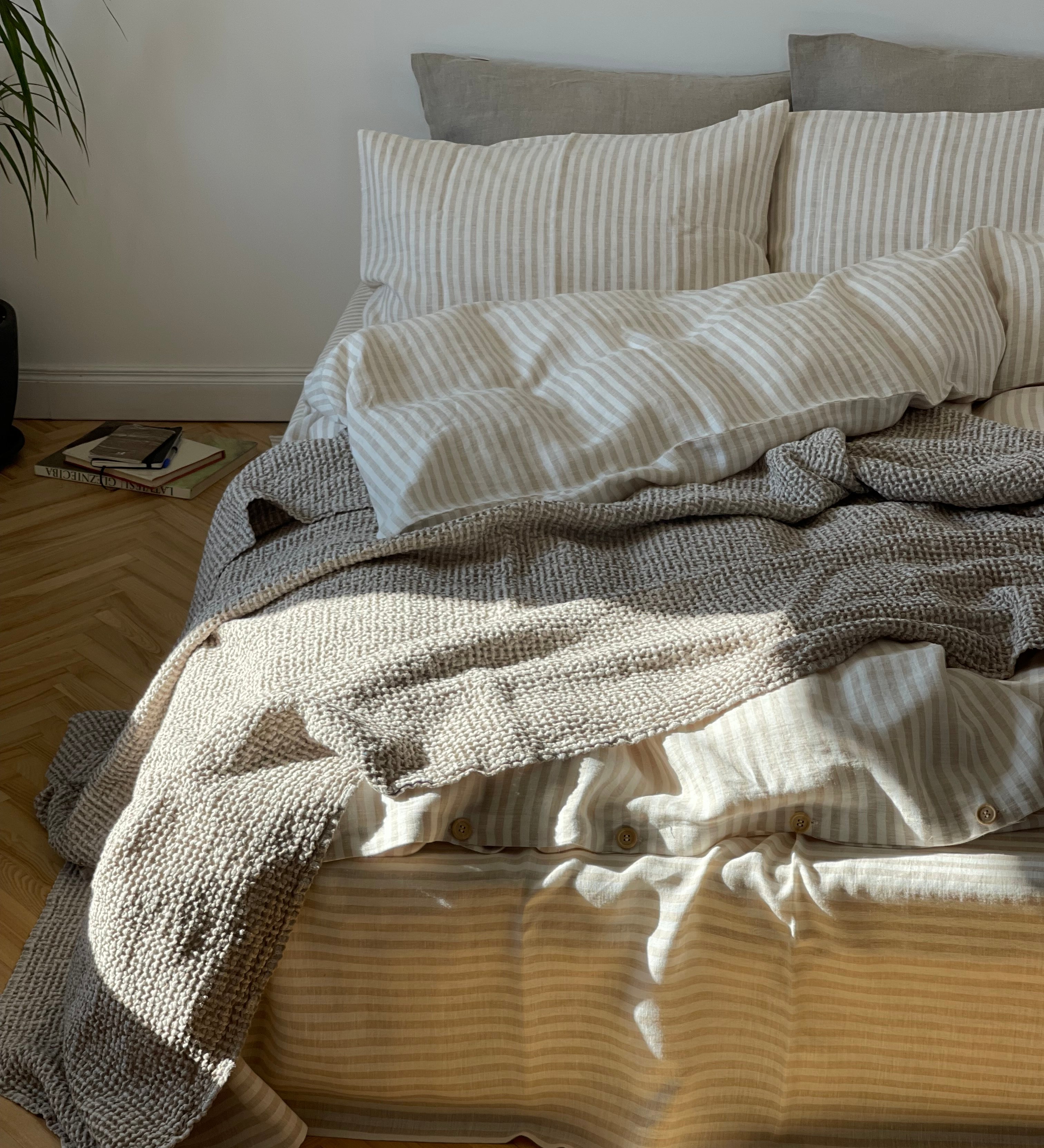 Dabīgi pelēki-balti mistrots lina/kokvilnas vafeļauduma gultas pārklājs, dažādi izmēri