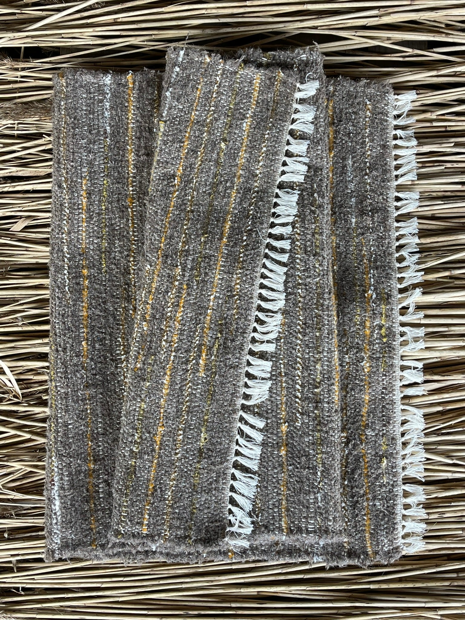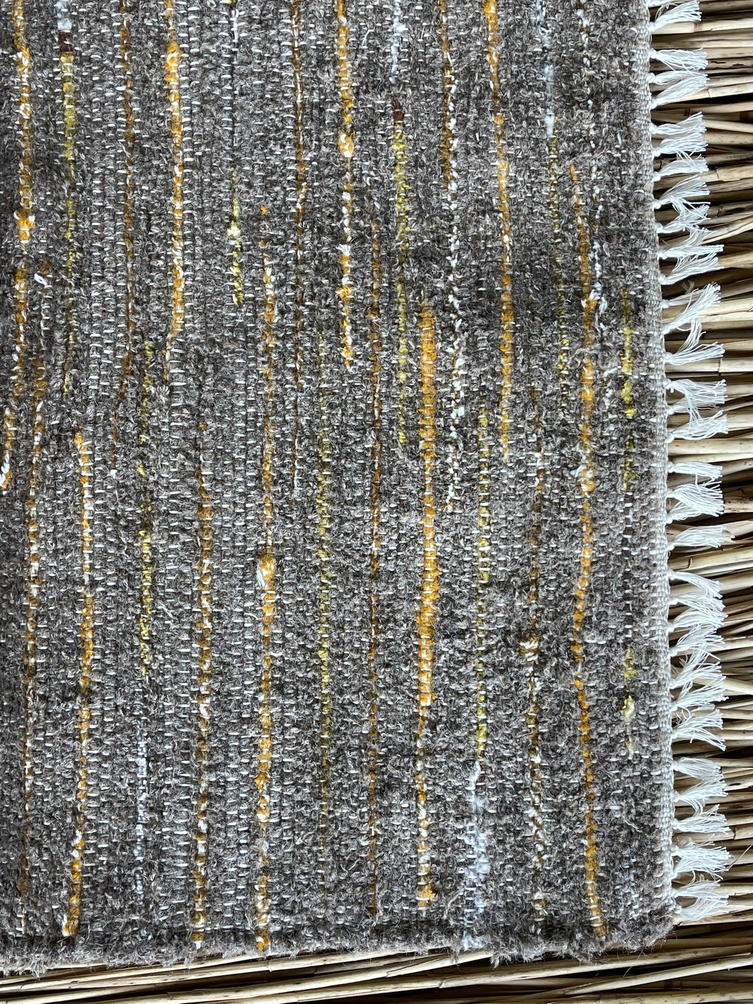 Brūnas, sinepju dzeltenas svītriņas, vilnas auduma grīdceliņš ~70x140cm