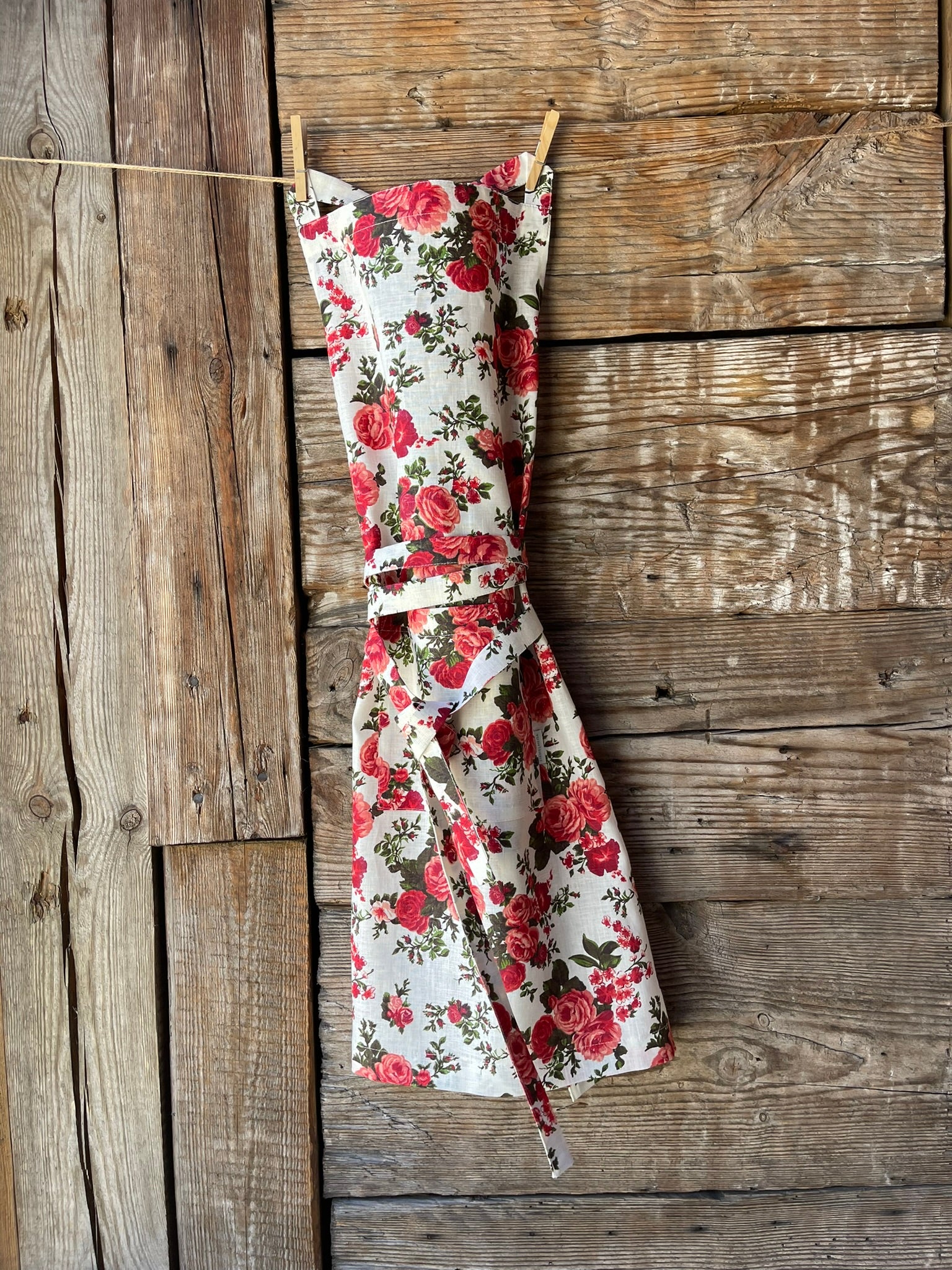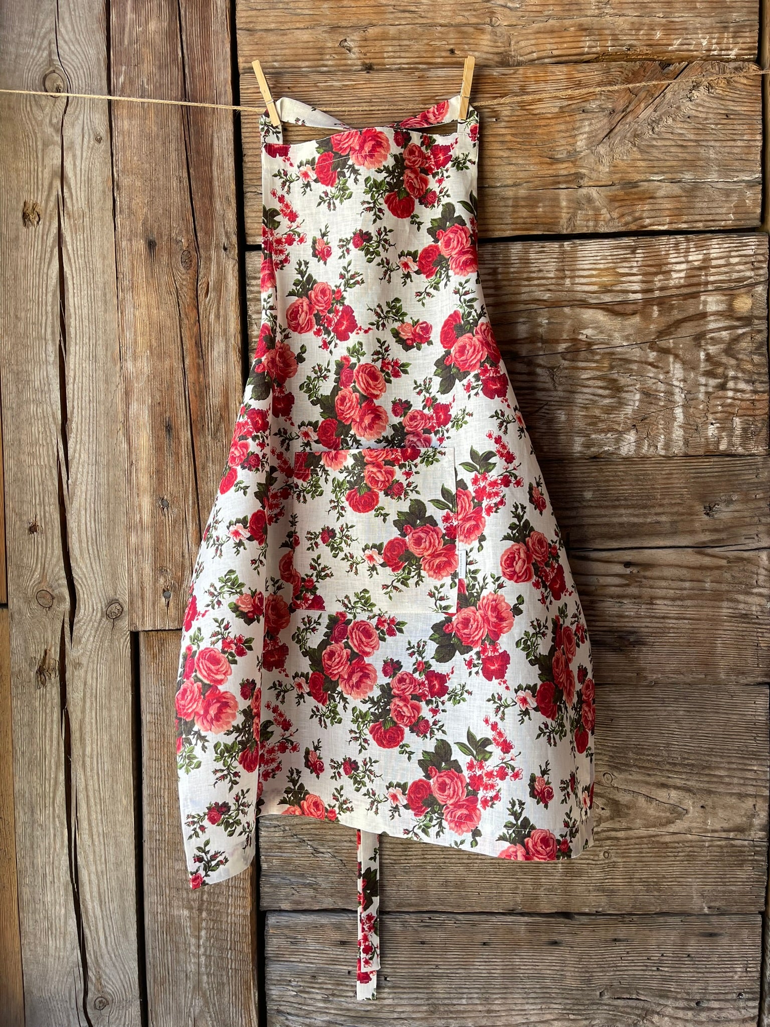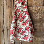 Priekšauts ar sārtām rozēm uz balta fona, 100% lina priekšauts ar kabatiņu un regulējamām lencēm