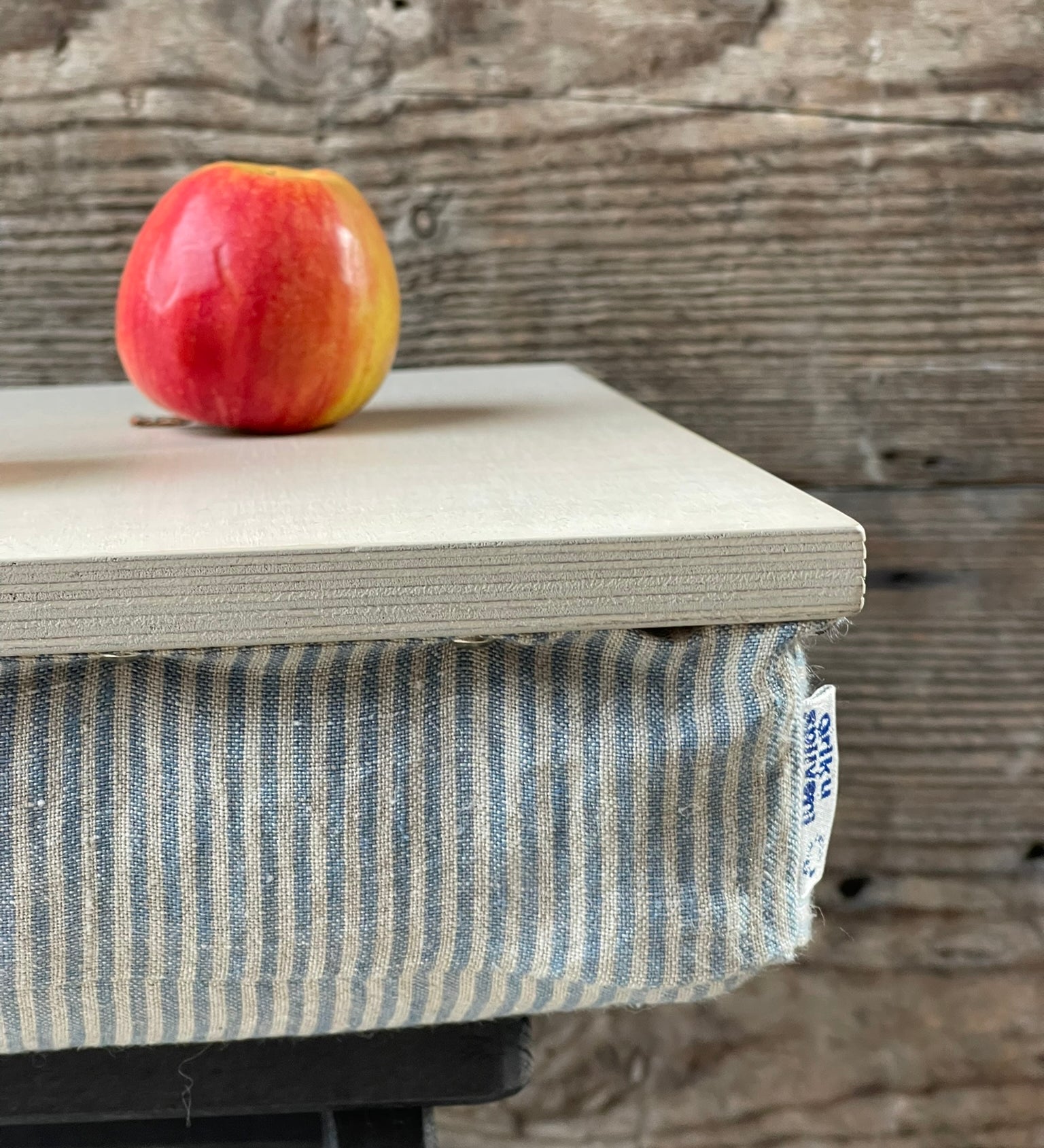 Brokastu paplāte, datora paliktnis, gultas paplāte, gaiši lazēts koks/gaiši zili svītrains spilvens