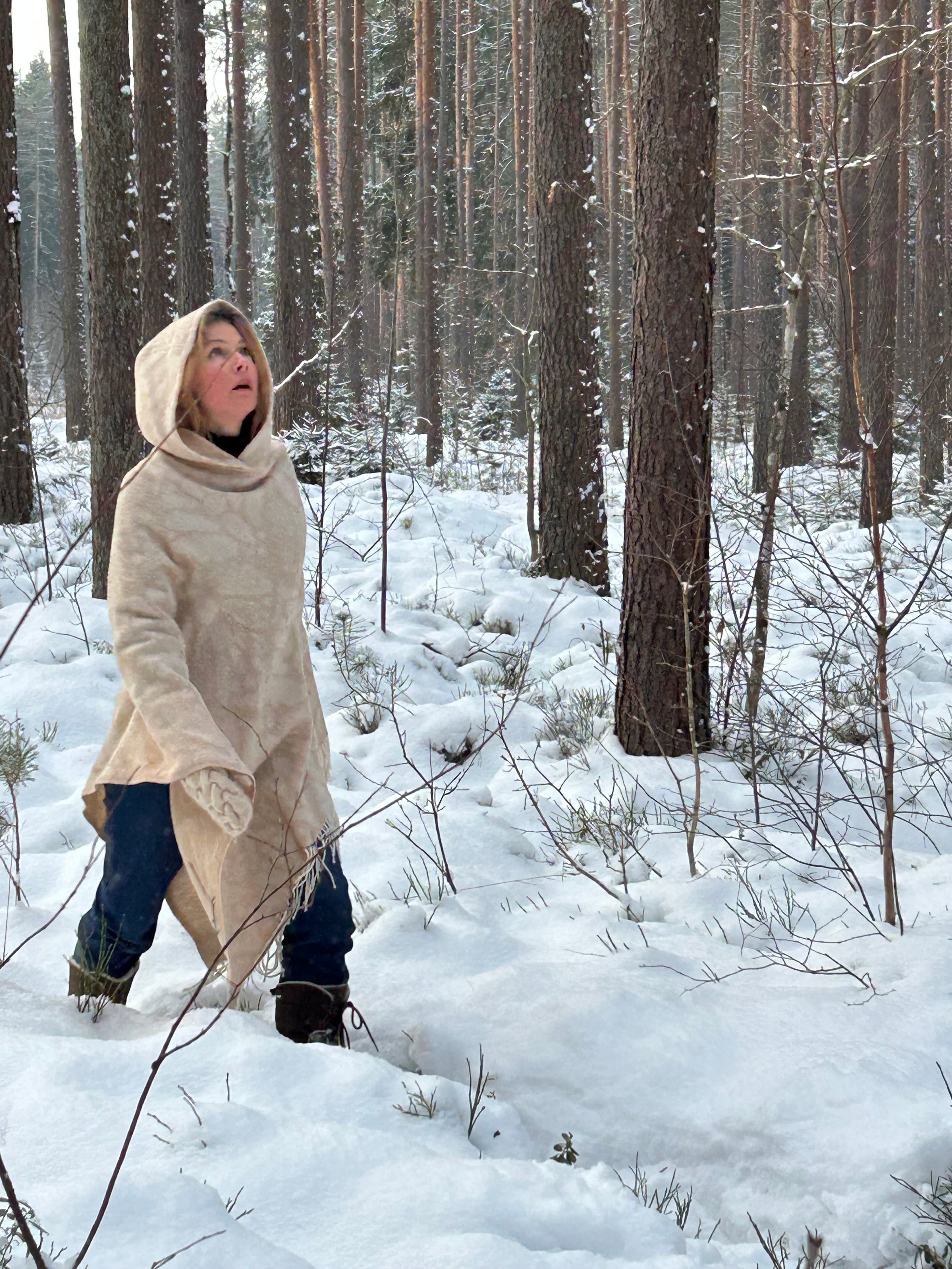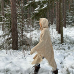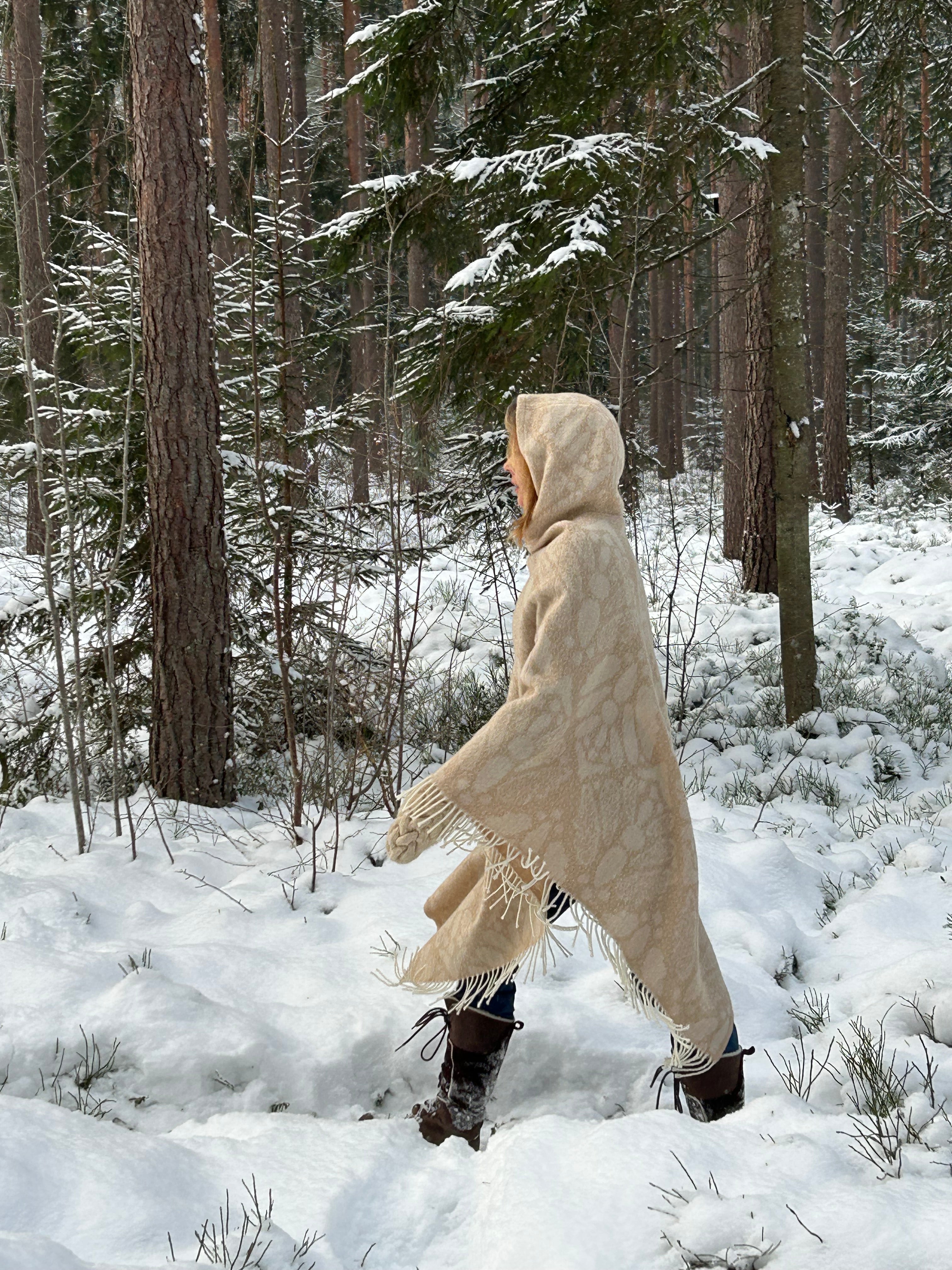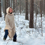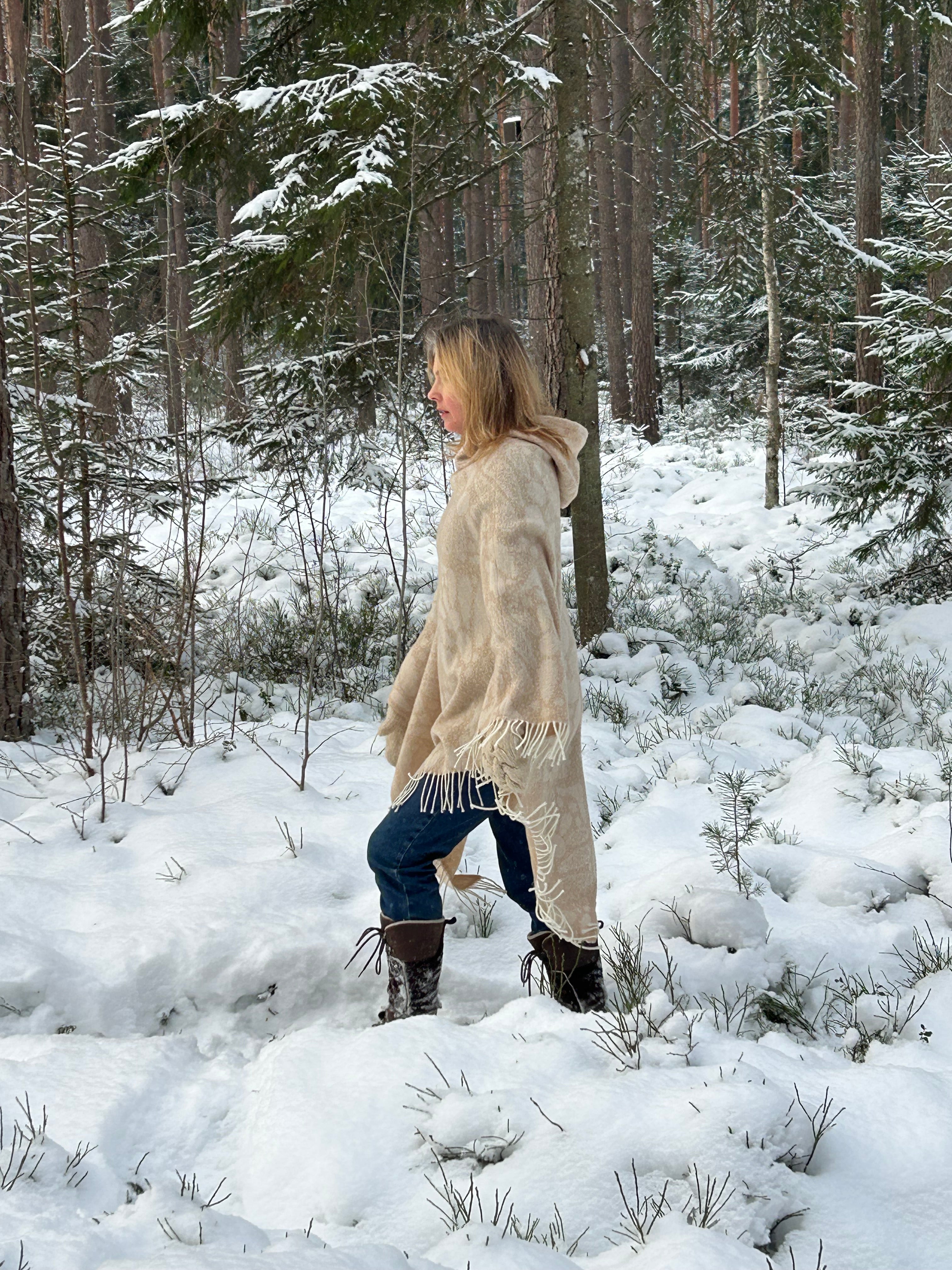 Bēšīga toņa garais 100% vilnas pončo ar kapuci un baltām bārkstīm