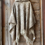 Dūmakaini brūna toņa indiāņu piegriezuma garais mohēras/alpakas/aitas vilnas pončo ar kapuci un bārkstīm ar lāsīšu dizainu