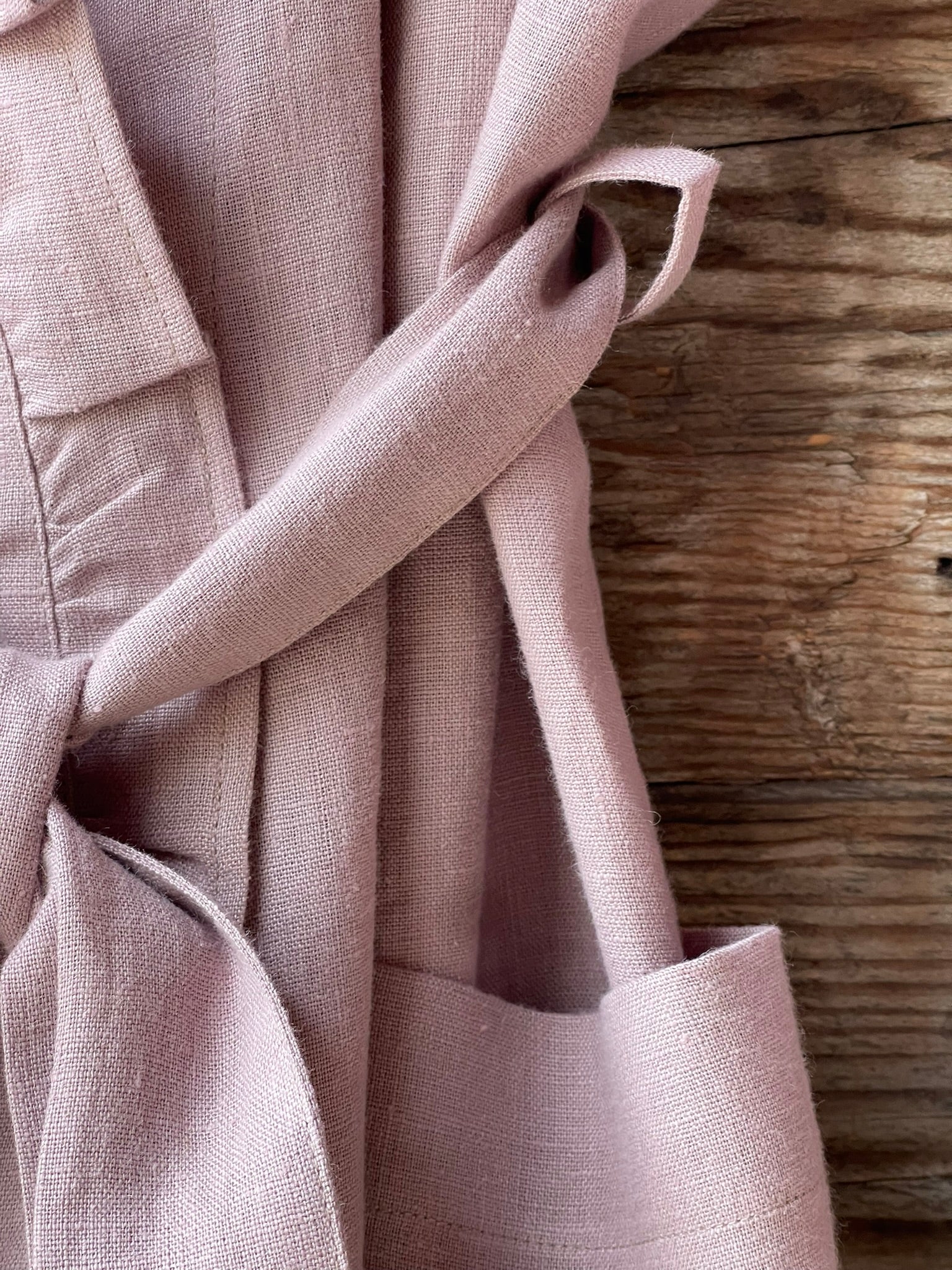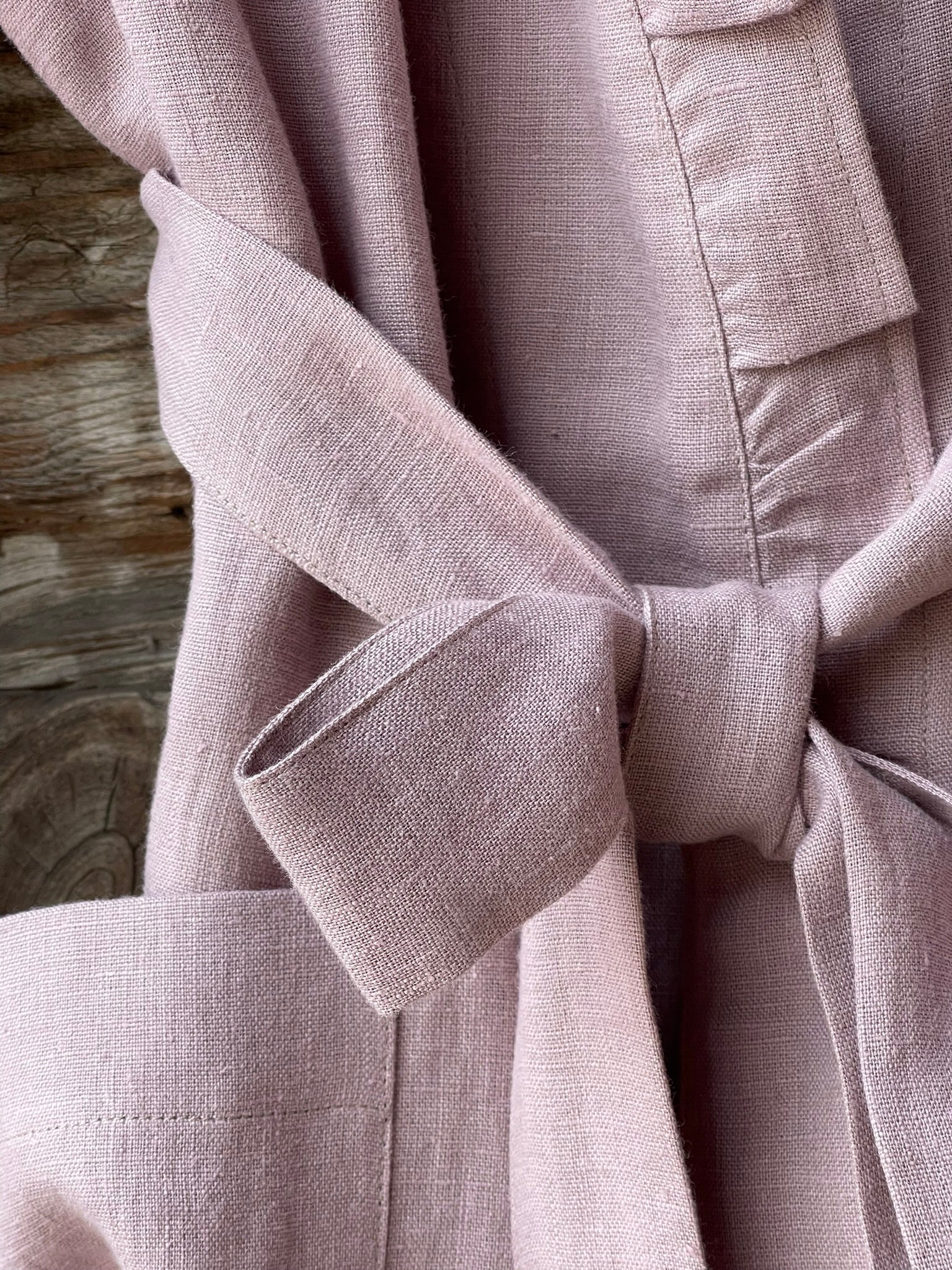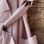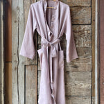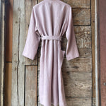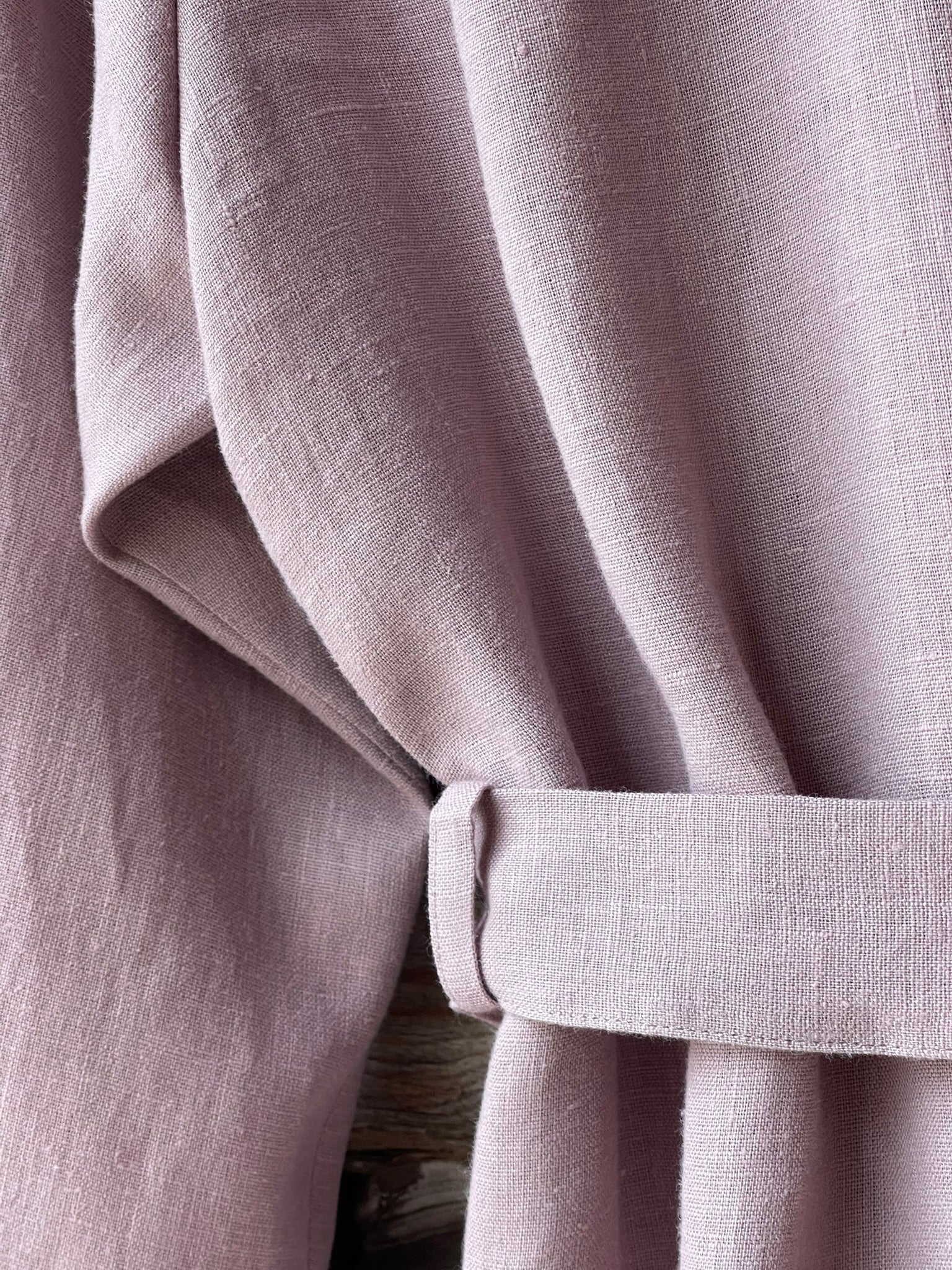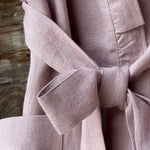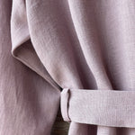 Pelēkas lavandas toņa mīkstināta lina auduma halāts ar cakiņu jostiņu, iešūtām piedurknēm, uzšūtām kabatām