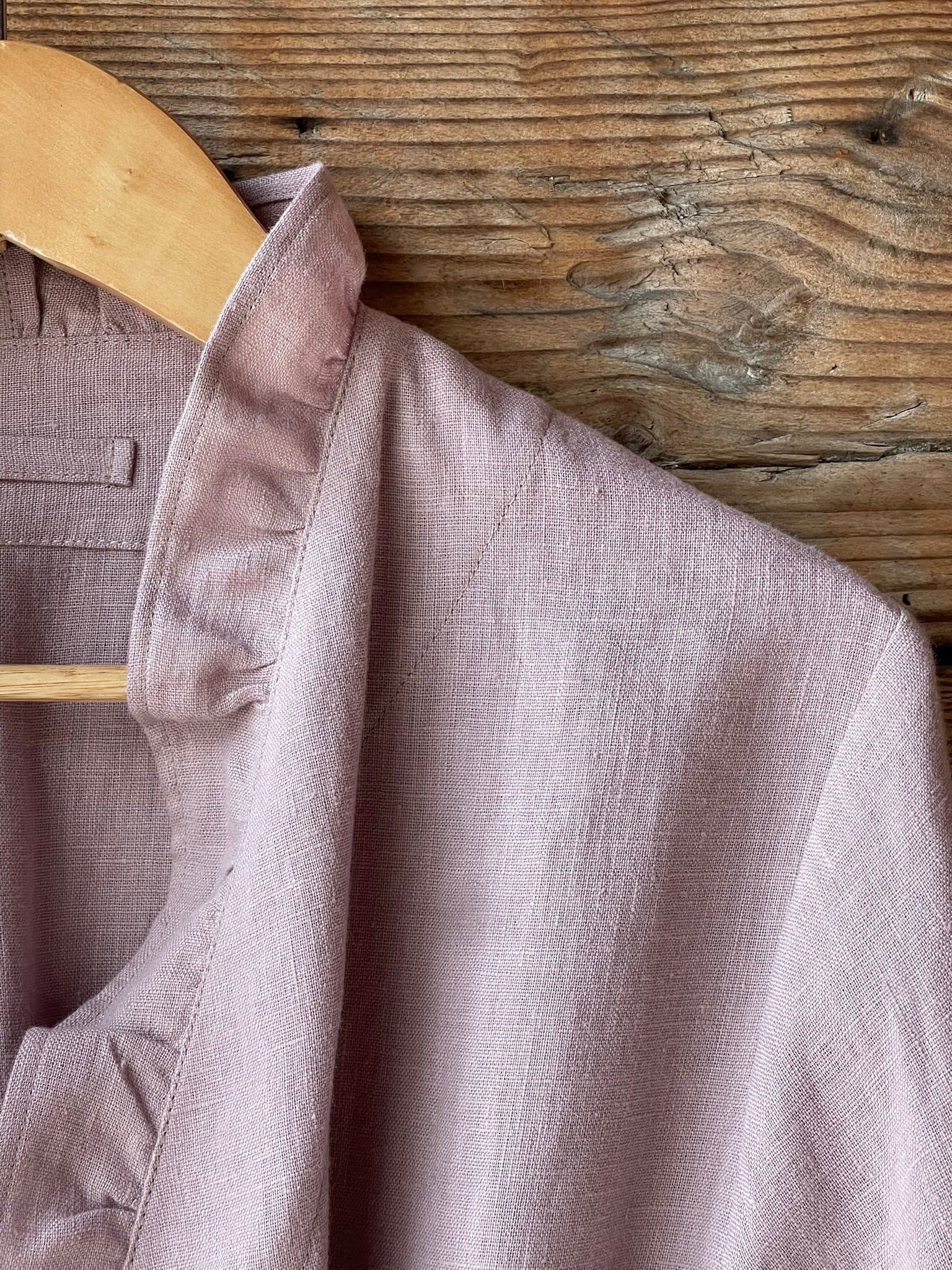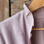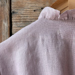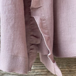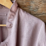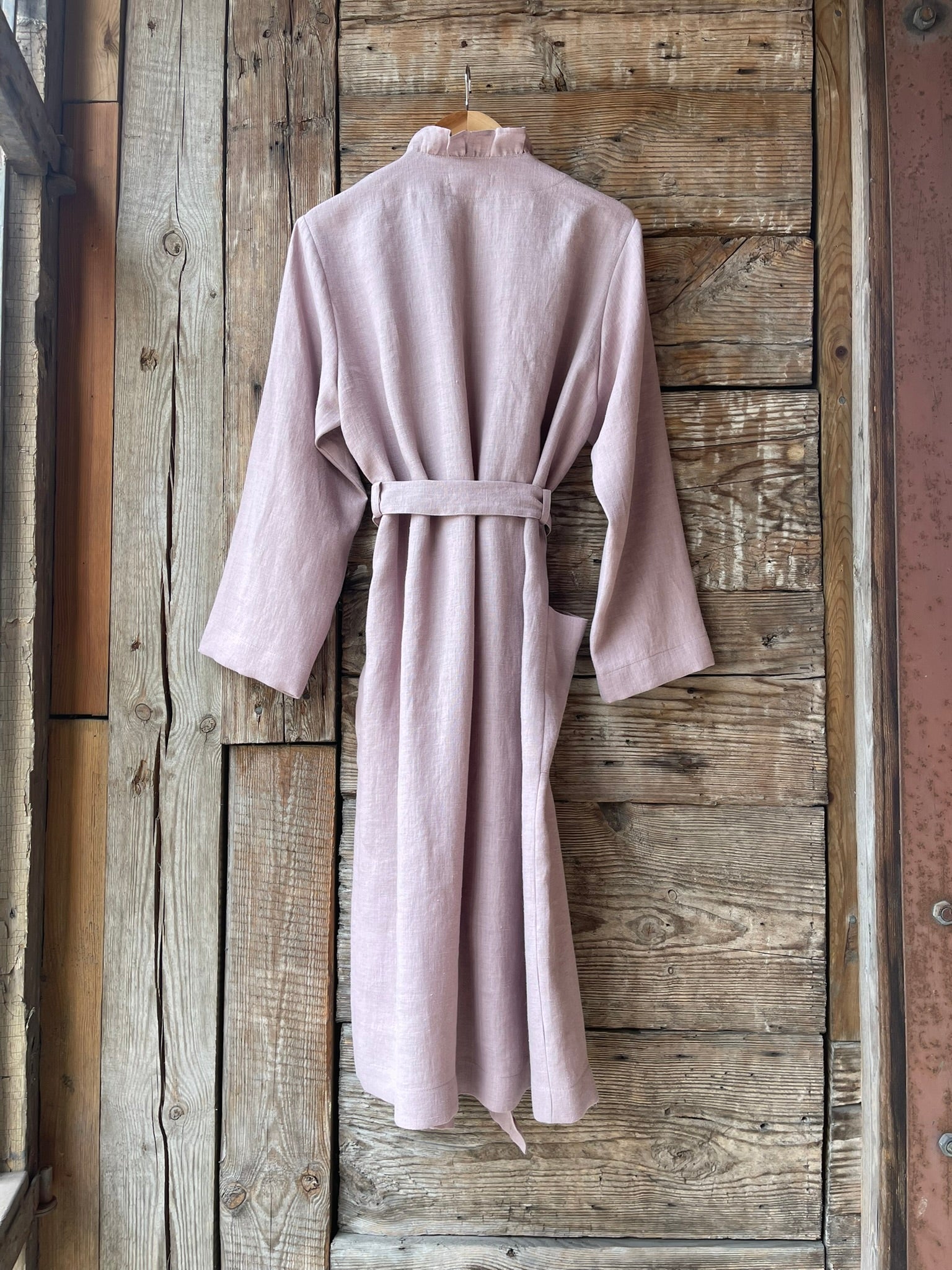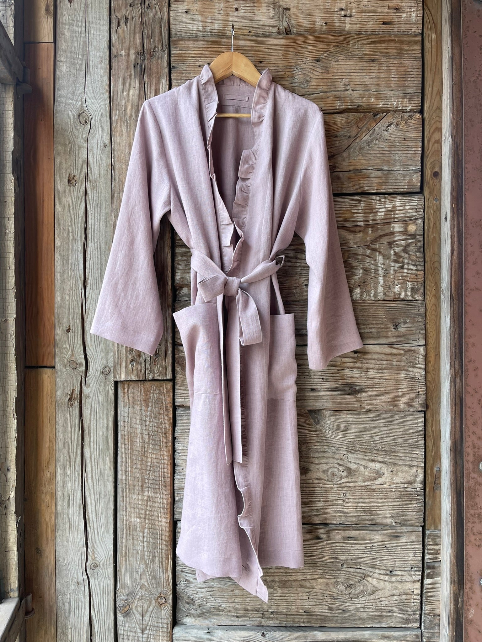 Pelēkas lavandas toņa mīkstināta lina auduma halāts ar cakiņu jostiņu, iešūtām piedurknēm, uzšūtām kabatām