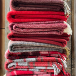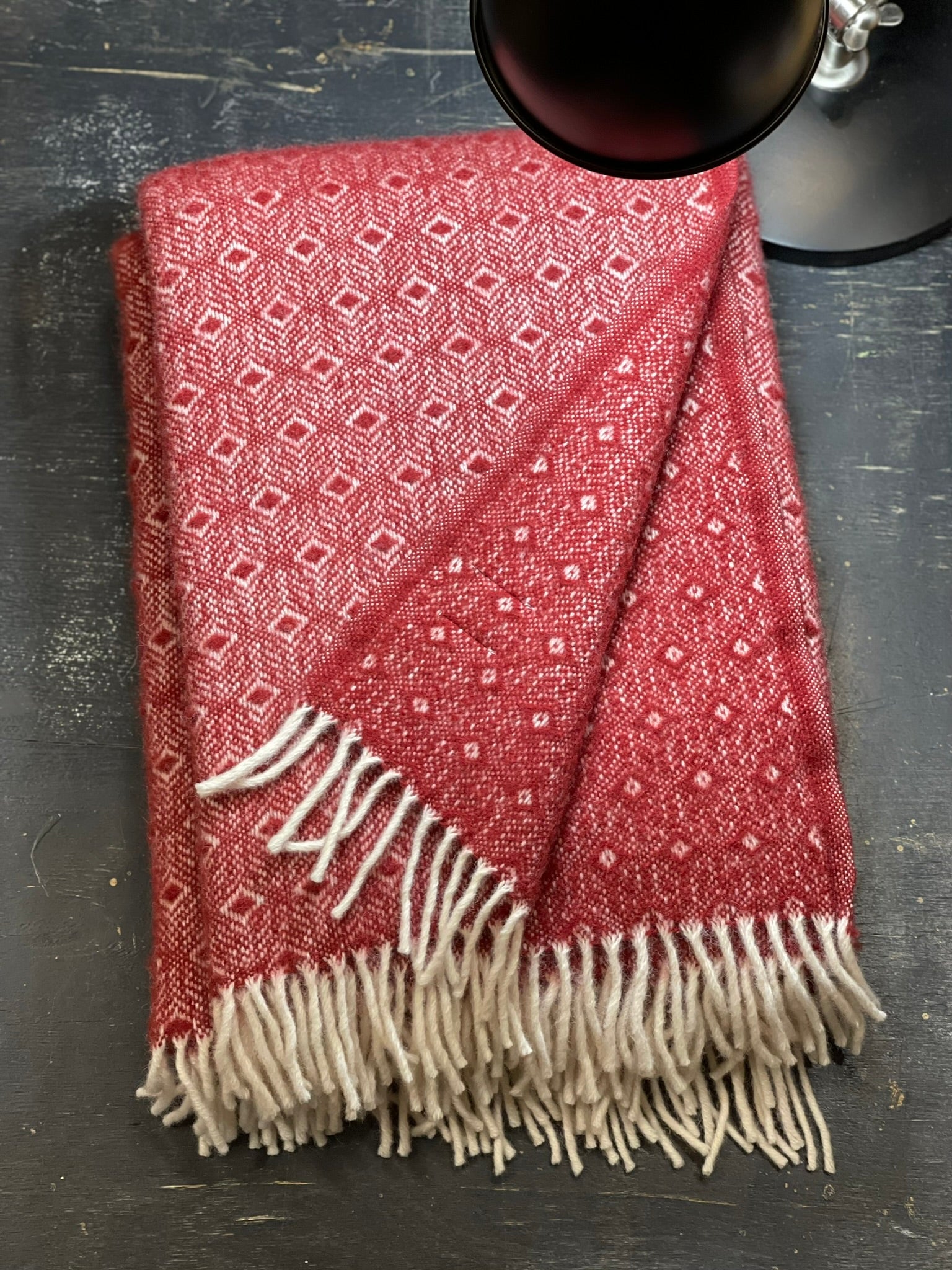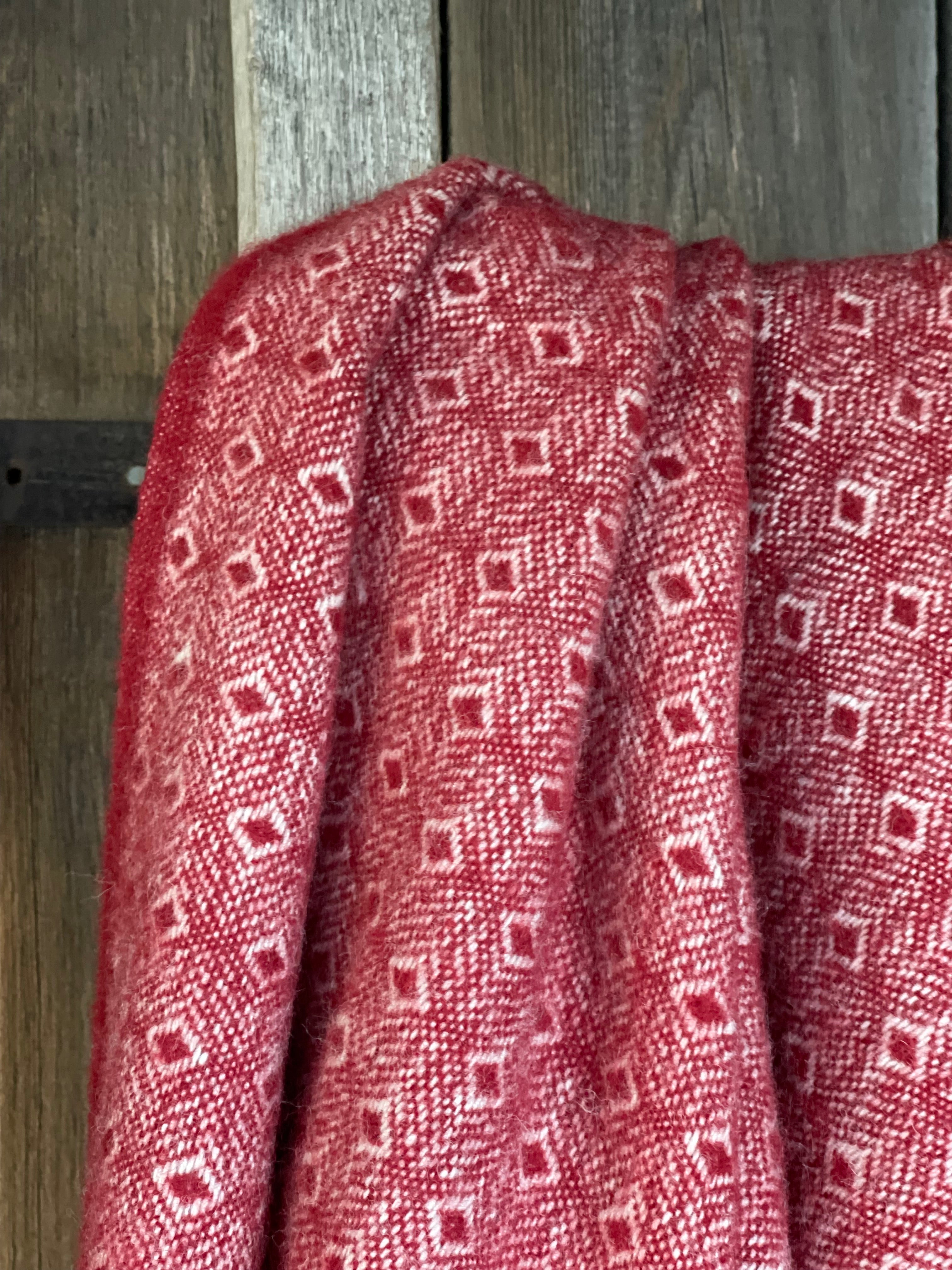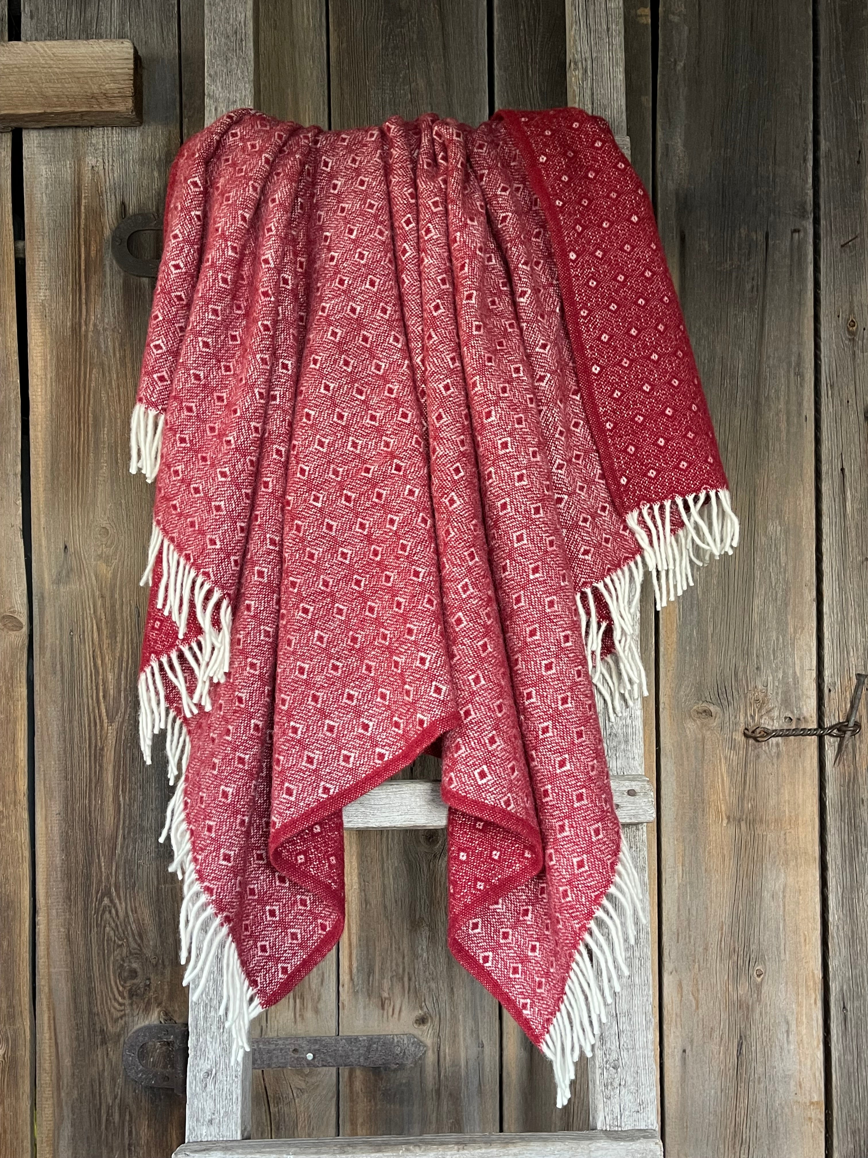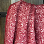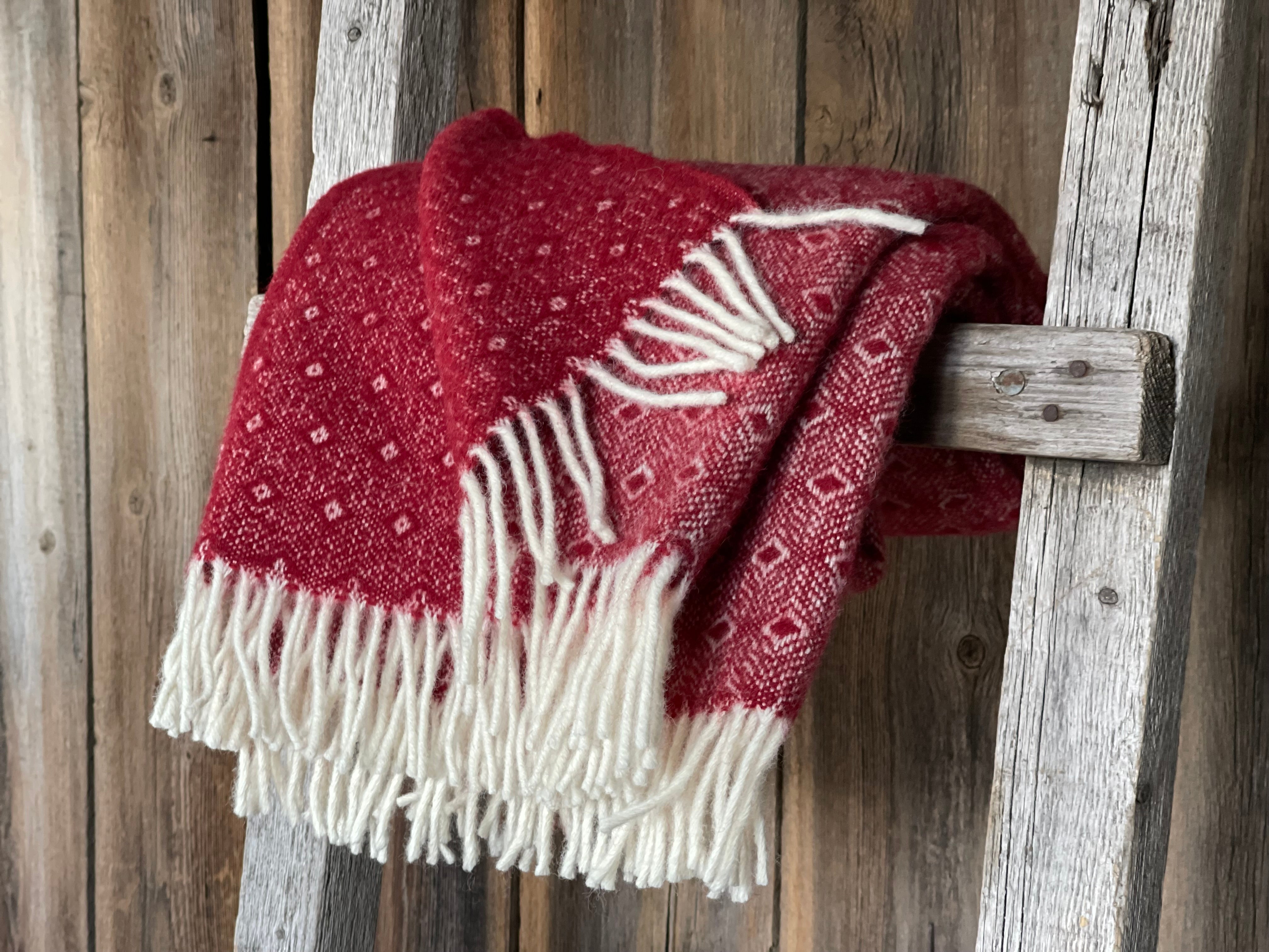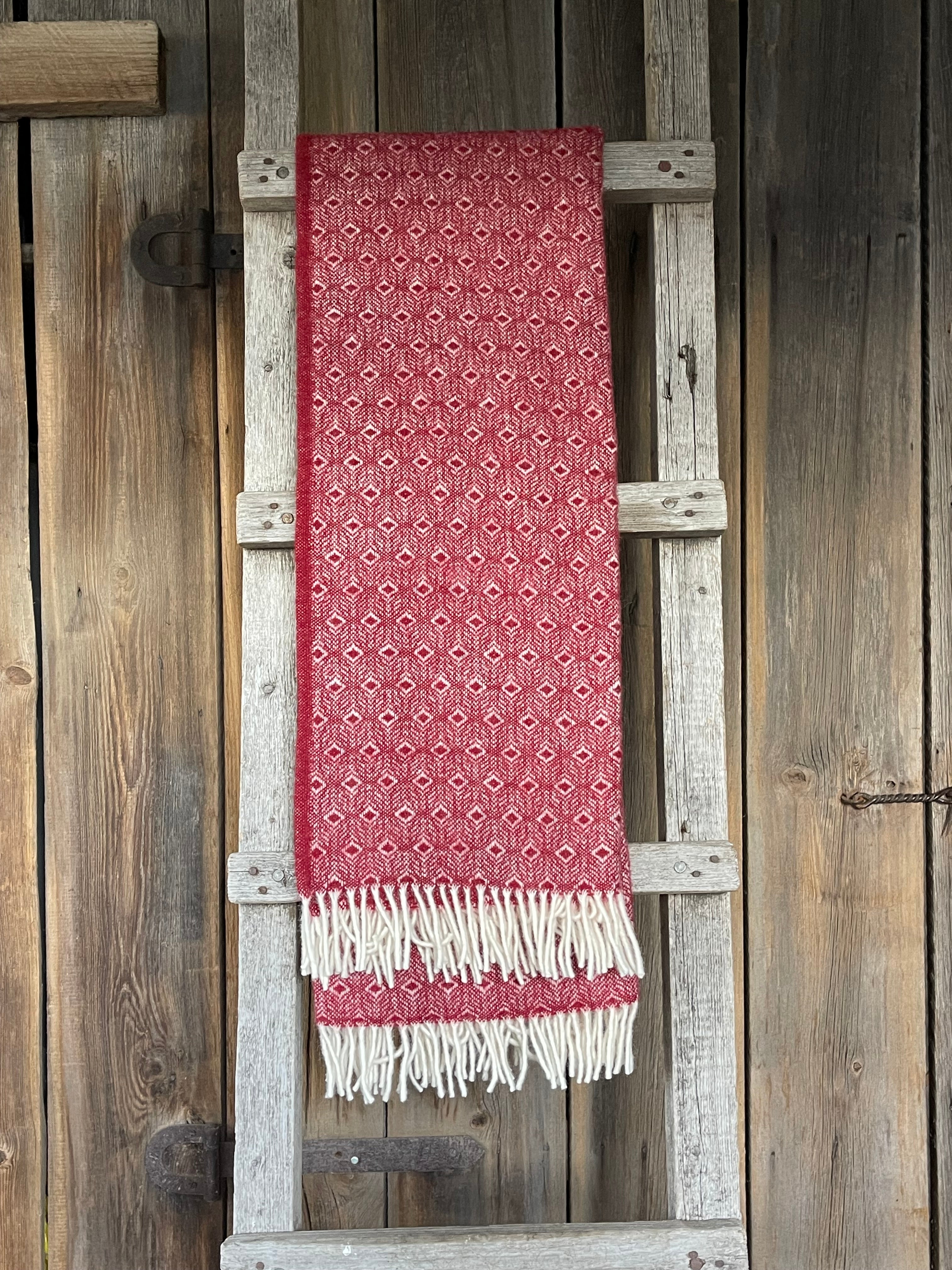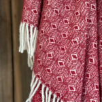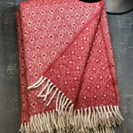 Sarkans aitas vilnas pleds ar baltu ornamentu un baltām bārkstīm 130x200cm
