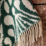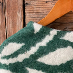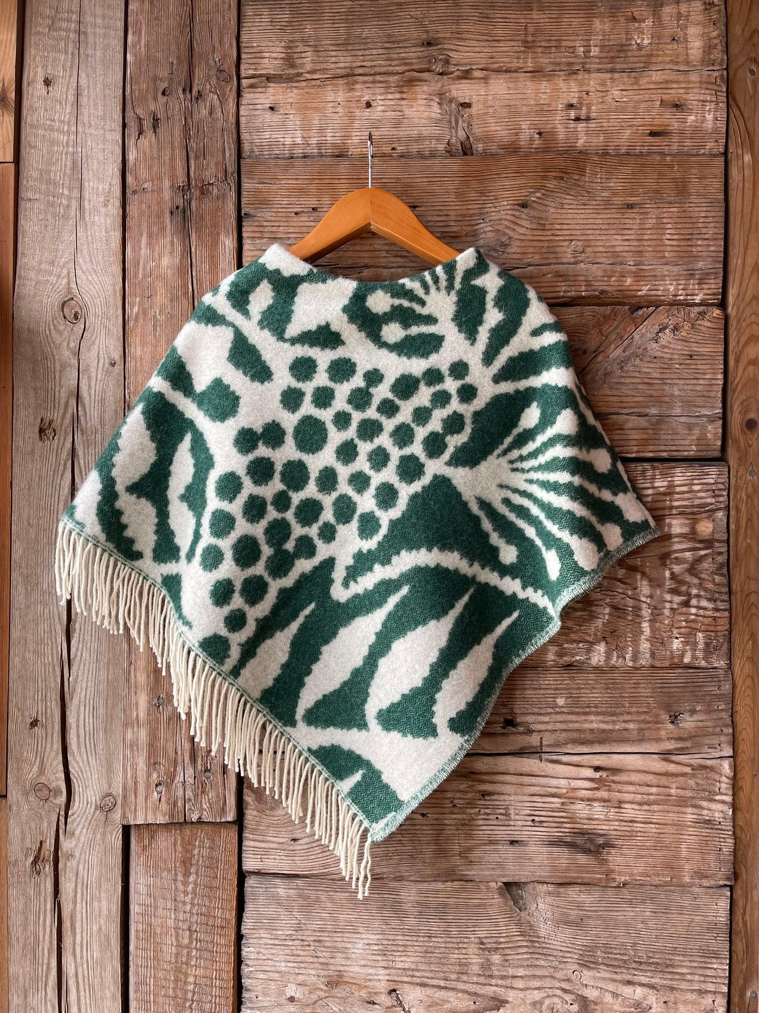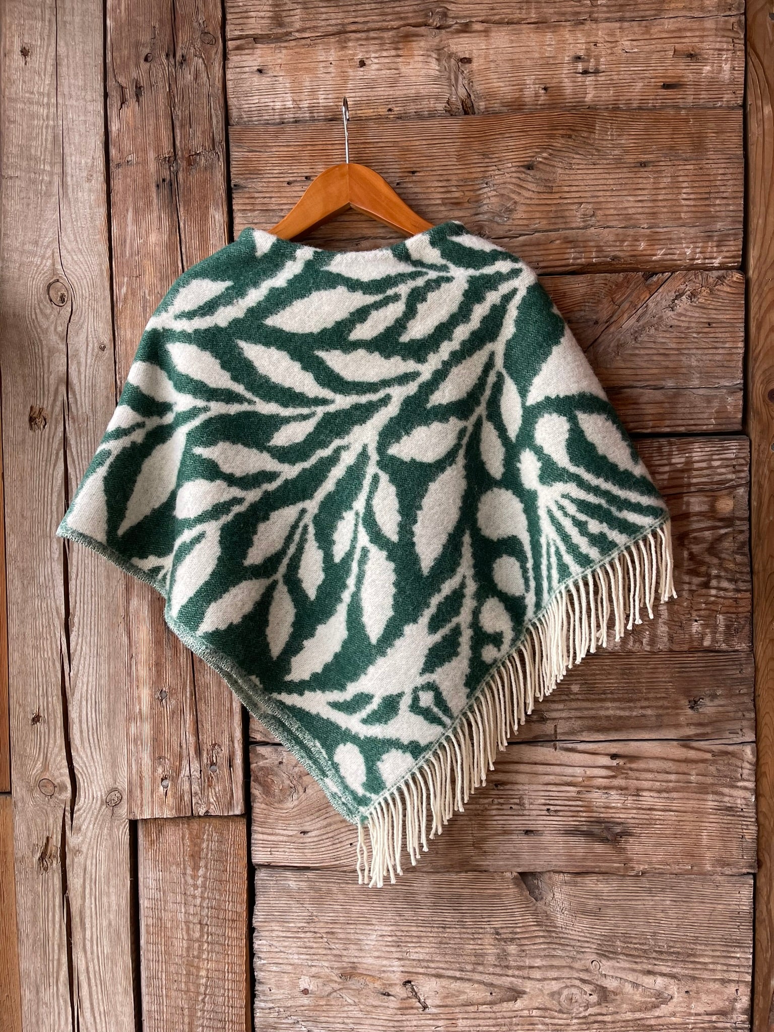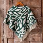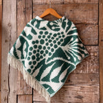 Zaļa toņa īsais/pusgarais aitas vilnas pončo ar baltām bārkstīm