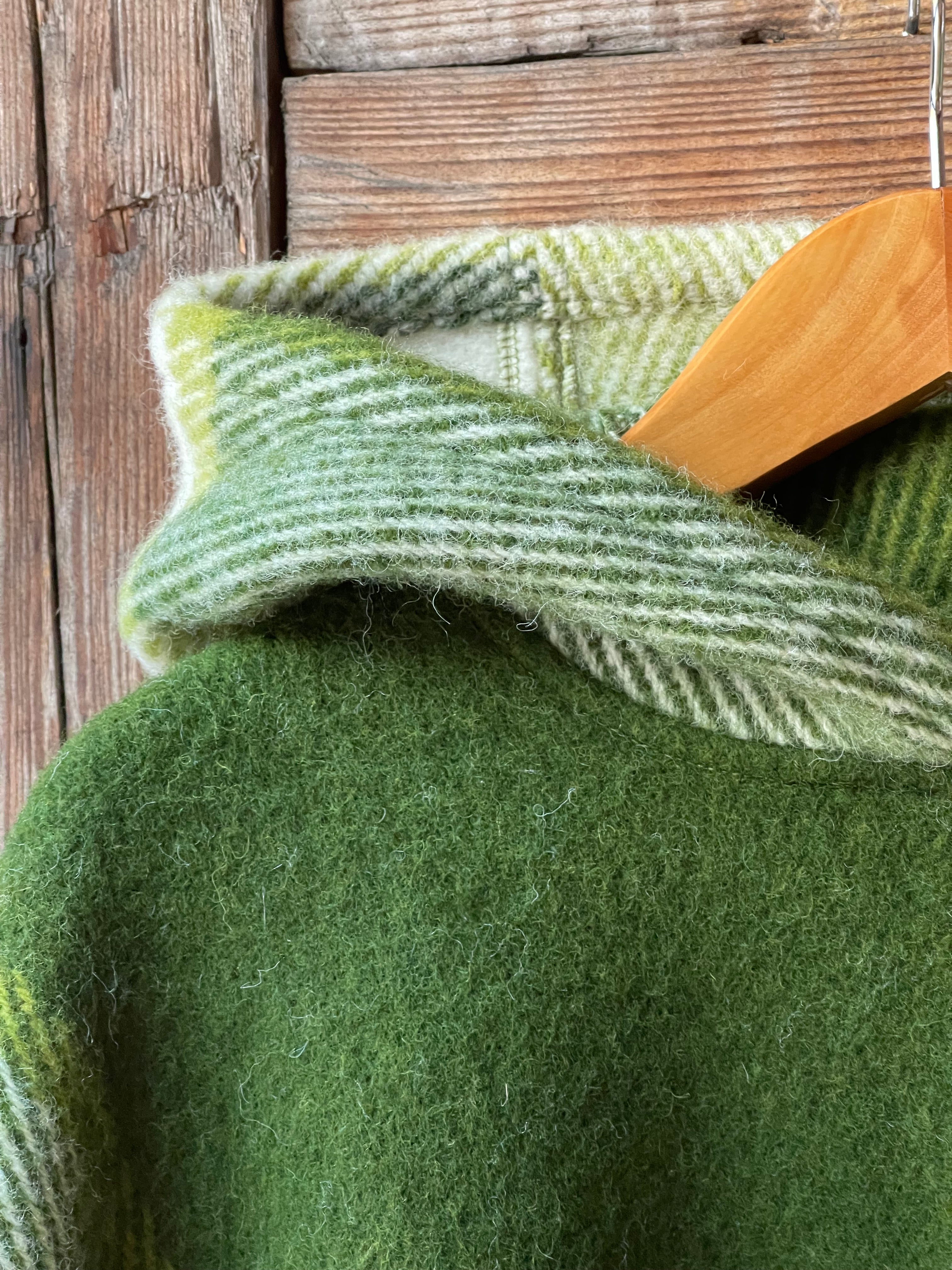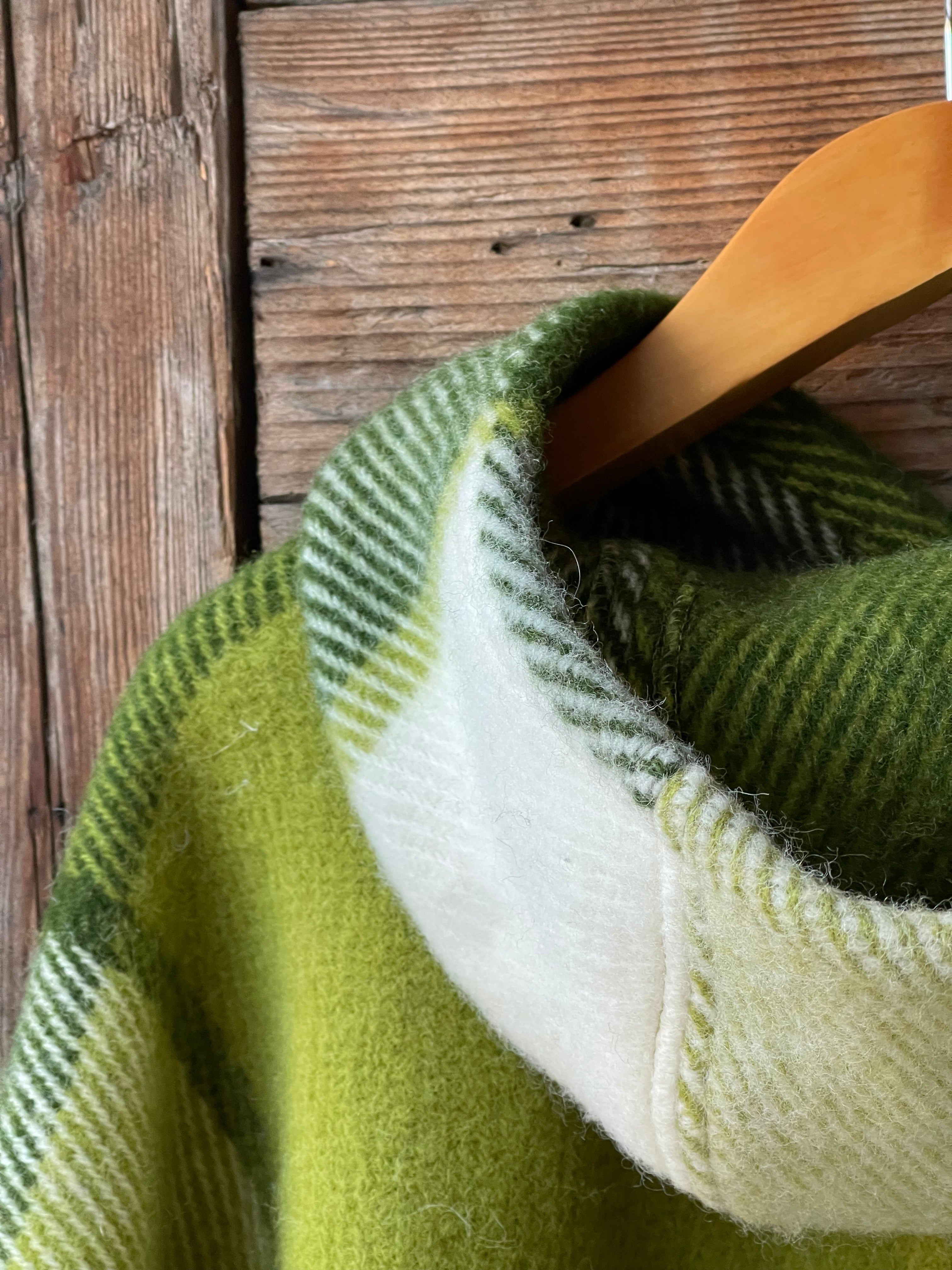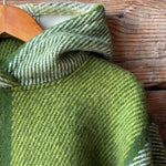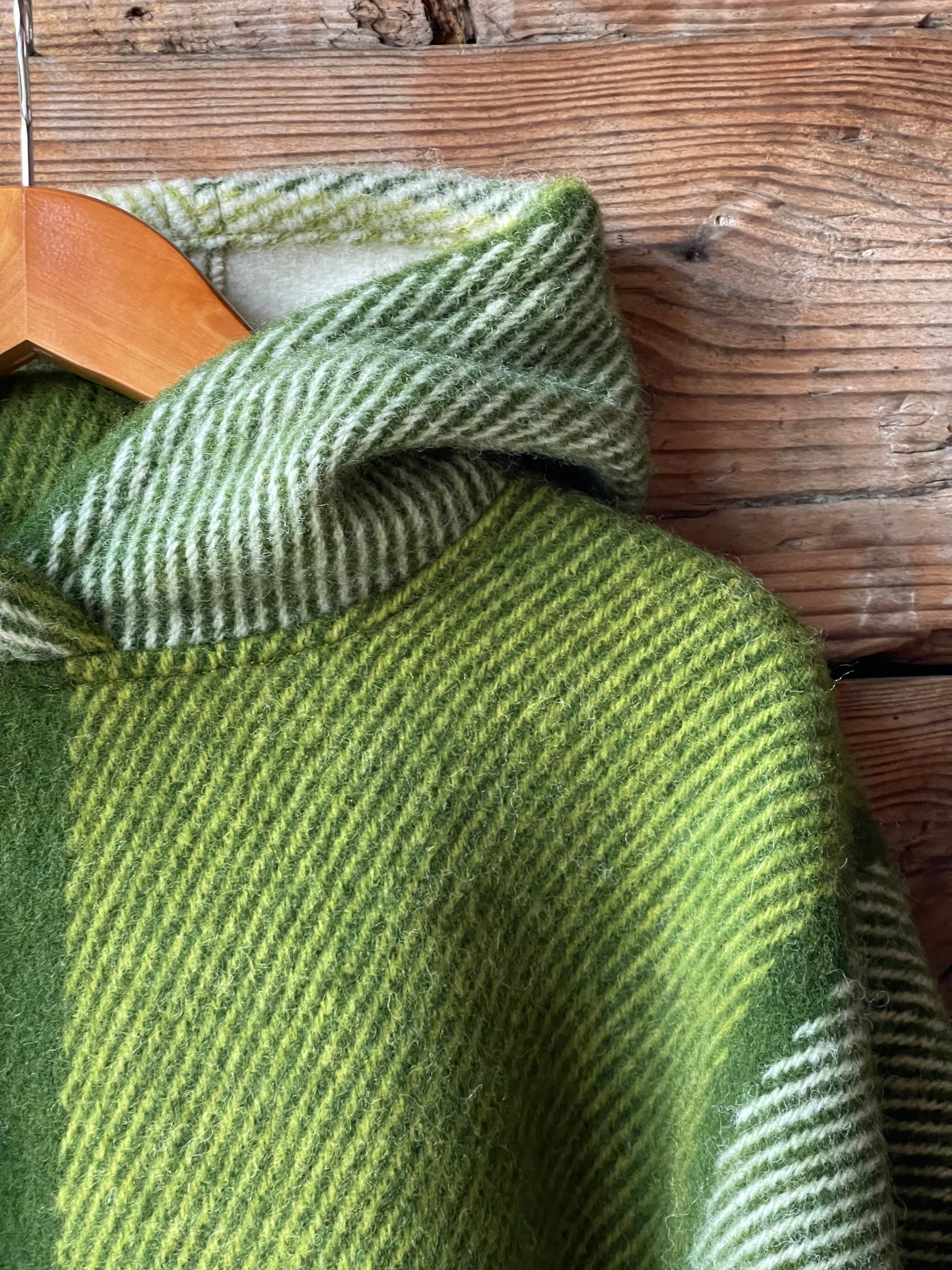 Zaļš/balts lieli rūtains indiāņu piegriezuma garais aitas vilnas pončo ar kapuci un bārkstīm